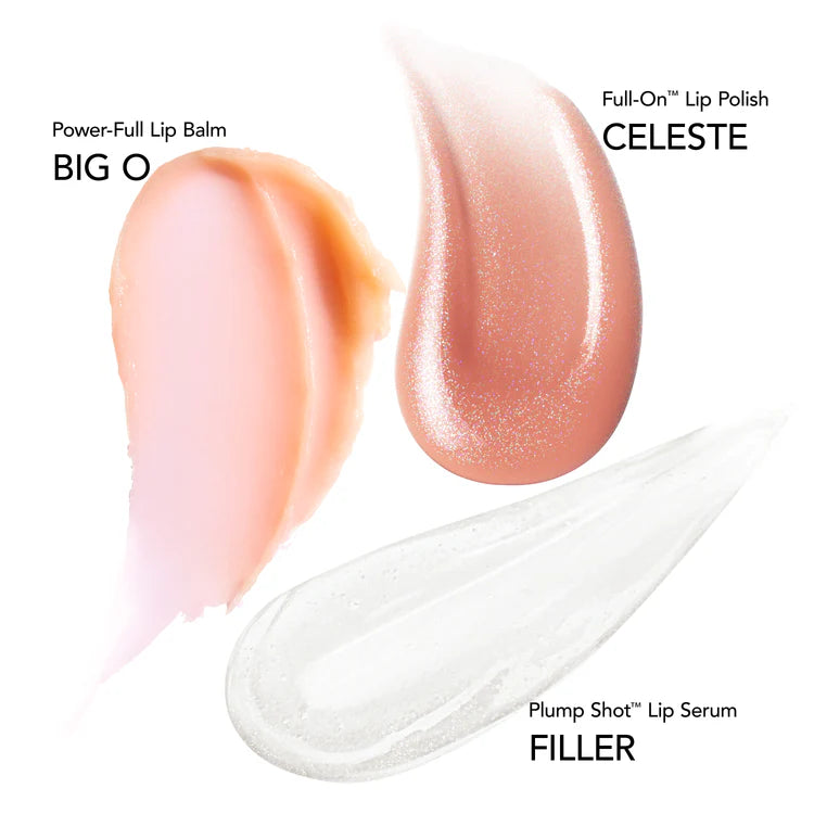Holiday gloss lineup = handled. Big O Lip Balm, Full-On™ Lip Polish in Celeste, and Plump Shot™ Lip Serum in Filler -- three full-size sweet treats for every level of plump.