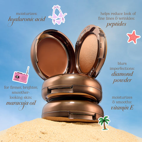 A 2-in-1 cream + baked powder bronzer for soft sculpting & sun-kissed warmth in seconds.