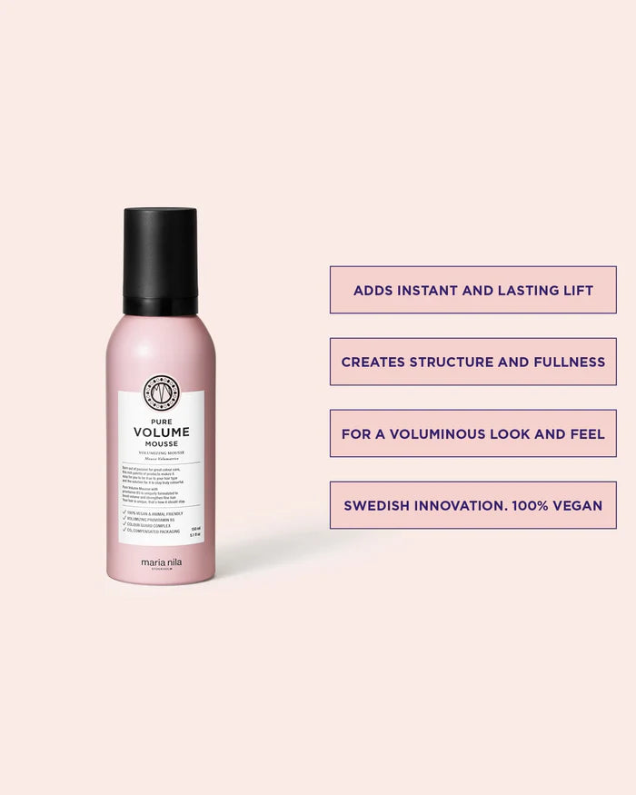 Pure Volume Mousse is a volumizing mousse designed to create fuller-looking hair, perfect for finer hair or anyone wanting lasting lift. Suitable for all hair types, it leaves your hair soft, smooth, and without any stickiness. Making your hair styling routine a refreshing experience.