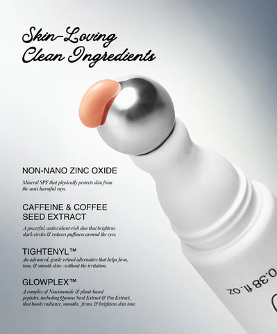 Featuring a cooling metal rollerball tip for instant depuffing, this innovative formula is powered by GlowPlex™ to smooth and brighten, Tightenyl™ to firm and tone, and Caffeine and Coffee Seed Extract to help reduce the look of dark circles and puffiness. Hypoallergenic, ophthalmologist-tested, and suitable for even sensitive skin, it instantly corrects, protects, and revives tired eyes for a refreshed, radiant appearance