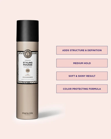 A volumizing mousse with medium hold that gives structure and leaves the hair healthy and shiny. Can be used as a foundation for an updo, before straightening and curling or to give hold to naturally curly hair. Styling Mousse has a fruity scent of pear.