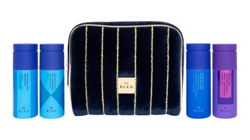 TRAVEL LIGHT, STYLE HEAVY. Effortless styling, anytime, anywhere. Featuring BLEU’s most iconic finishers, this travel set builds body, refreshes roots, smooths strands, and locks in your look with editorial precision. All tucked inside a luxe pouch that is giftable and ready to travel.