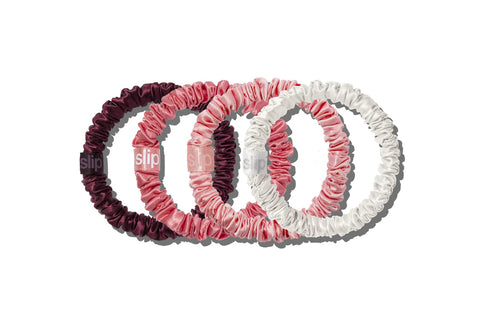 This set includes: 1 x crimson, 1 x blush, 1 x evie, 1 x white pure silk skinny scrunchies
